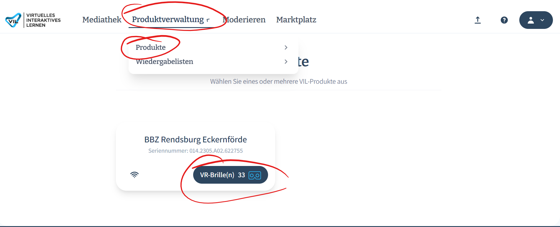 Das Aufspielen der Inhalte erfolgt im VIL Portal unter „Produktverwaltung → Produkte → VR Brillen“